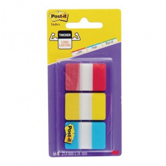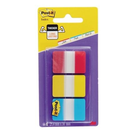 W opakowaniu 3 zestawy zakładek po 22 sztuki w rozmiarze 25,4x38mm w kolorach: czerwony, żółty, niebieski.