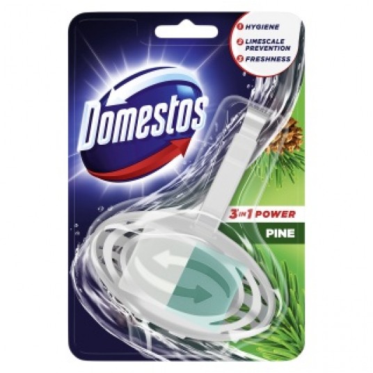 kostka toaletowa DOMESTOS Pine w innowacyjnym koszyku, który dopasowuje się do toalety, dzięki czemu optymalnie rozprowadza aktywne składniki w muszli toaletowej